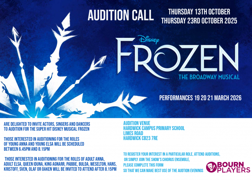 BOURN PLAYERS ARE DELIGHTED TO INVITE ACTORS, SINGERS AND DANCERS TO AUDITION FOR THE SUPER HIT DISNEY MUSICAL FROZEN